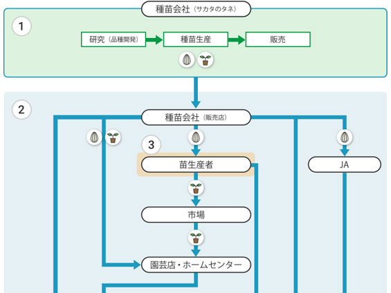 サカタのタネは「種苗会社」です。種苗会社の役割をタネや苗の商流を見ながらご紹介しています。