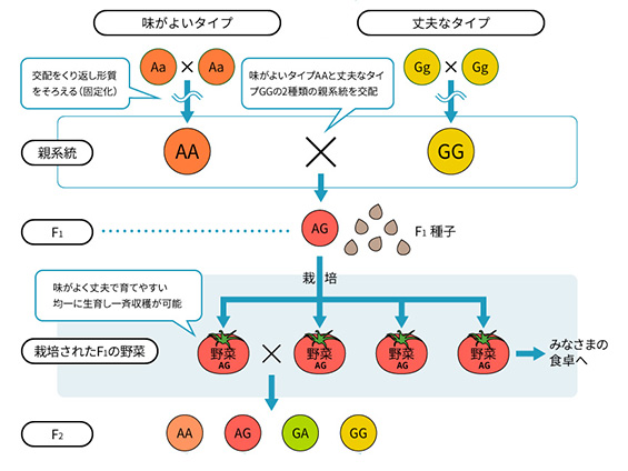 種苗会社でよく使う「品種」について、「F1種(交配種)」の育成にも簡単に触れながらご紹介しています。