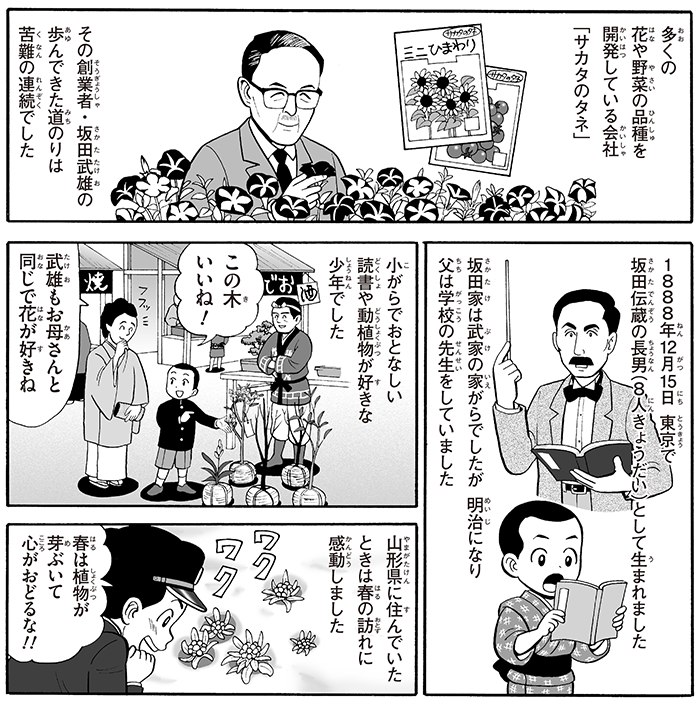サカタのタネの創業者、坂田武雄の人生を漫画でご紹介しています。どうぞお楽しみください。
