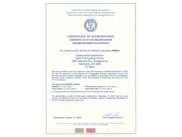 Certified by the International Seed Testing Association (ISTA) accredited Seed Testing Dept. for the first time in the history of private companies in Japan.