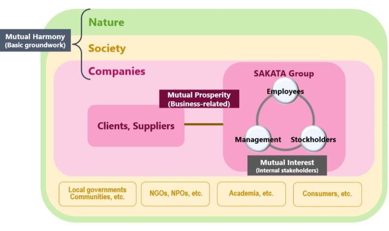 The mutual prosperity of employees, management, and stockholders. This principle asserts that SAKATA Group’s employees, management, and stockholders are one entity and that their happiness together is integral.