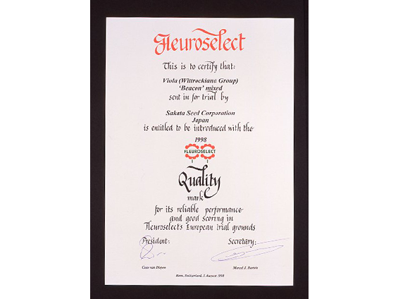 フロロセレクト(Fleuroselect(FS):欧州花き種苗審査会)は、1970年に創設された花の業界団体で、新品種の審査、保護および普及活動を行っています。当審査会にエントリーされた品種はヨーロッパ各地にある栽培試作地で新規性、実用性を評価し、受賞品種を決定するものです。受賞品種の中でも特に優れた品種には、ゴールドメダルが贈られるとともに、ヨーロッパ、アメリカ、アジアにある多数の公共ガーデン(庭園)で展示され、一般園芸愛好家および営利生産者に対し啓蒙活動が行われています。ここではゴールドメダル受賞品種をご紹介しています。