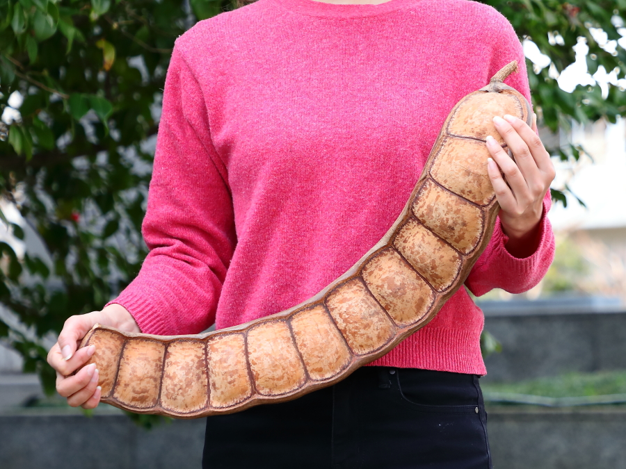 見た目はどら焼きみたいなモダマのタネ。表面はつるっとして手触りよし、色もこんがり、申し分なし。そのまま食べてしまいたくなるほどにおいしそうですが......。とにかく硬い。間違ってかじれば歯が折れてしまいそうです(絶対にまねしないでくださいね)。海や川に浮かんで長い旅をするモダマ。この硬さで身を守っているのかもしれません。